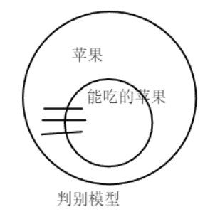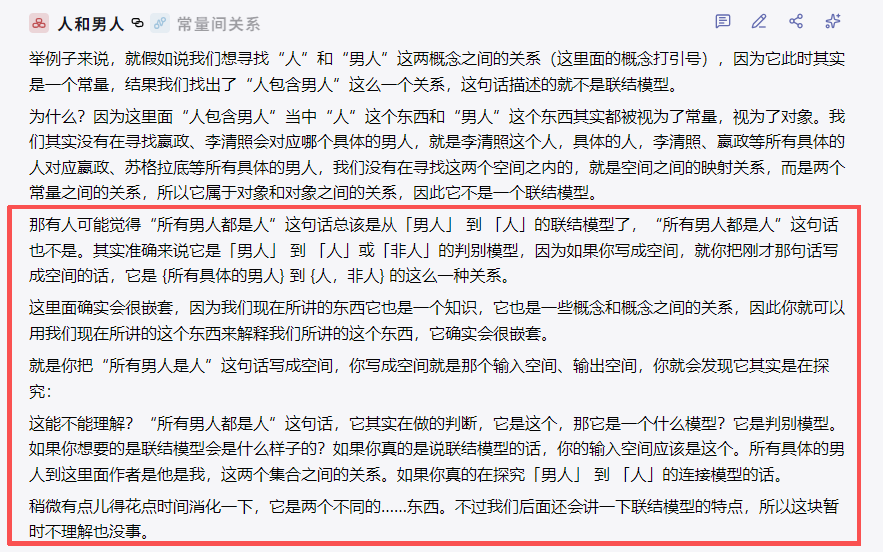 “所有苹果都是可食用的”和“所有男人都是人”,属于同类句式,前者你能画出两幅图,后者你只能绘出一幅图。用模型的方式表达肯定是完全一致的。要么【都是判别模型、【要么都是联结模型呢】或者【可以看成判别模型也能看成联结模型(实际错误)】。之所以说和模型是否错误有关是因为你凭借”男人和人只有包含关系“这一符合现实角度的结论排除了画联结模型的可能,但保留了苹果画联结模型的可能。因为现实里男人确实全是人,但苹果既有可食用的也有不可食用的。但是,如果从现实角度考虑,苹果和可食用间不可能是判别模型,因为存在不可食用的苹果。但如果不从现实世界考虑,那么你就不该放弃从联结模型绘制男人和人之间关系的图