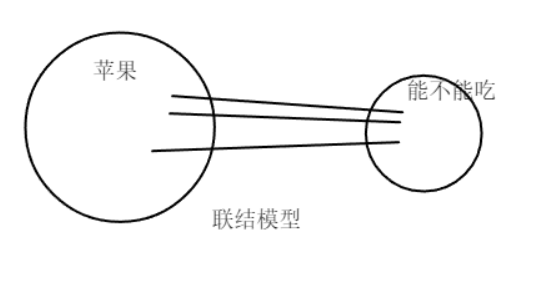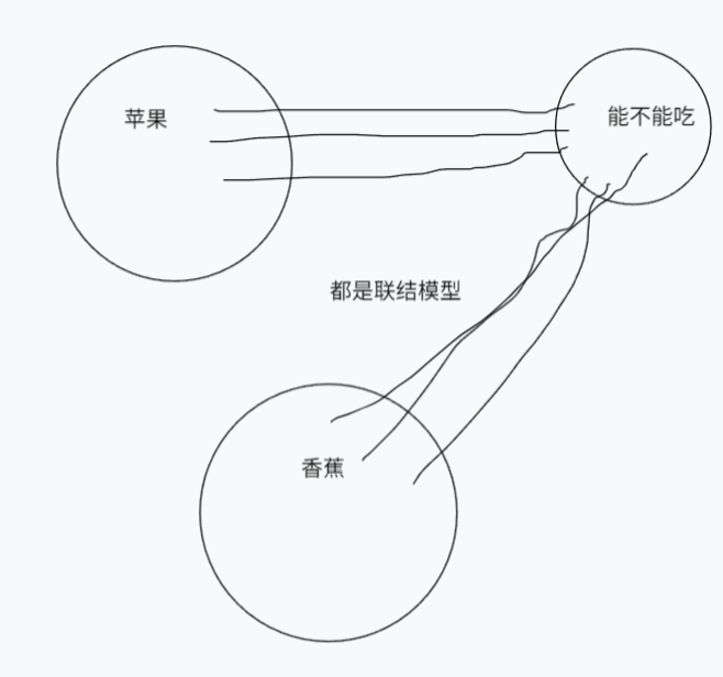 再PS:我将苹果和能吃画成了联结模型的样子,你能否把男人是人画成联结模型的样子?我画不出来。因为男人和人只有包含关系,而苹果和能不能吃可以独立。